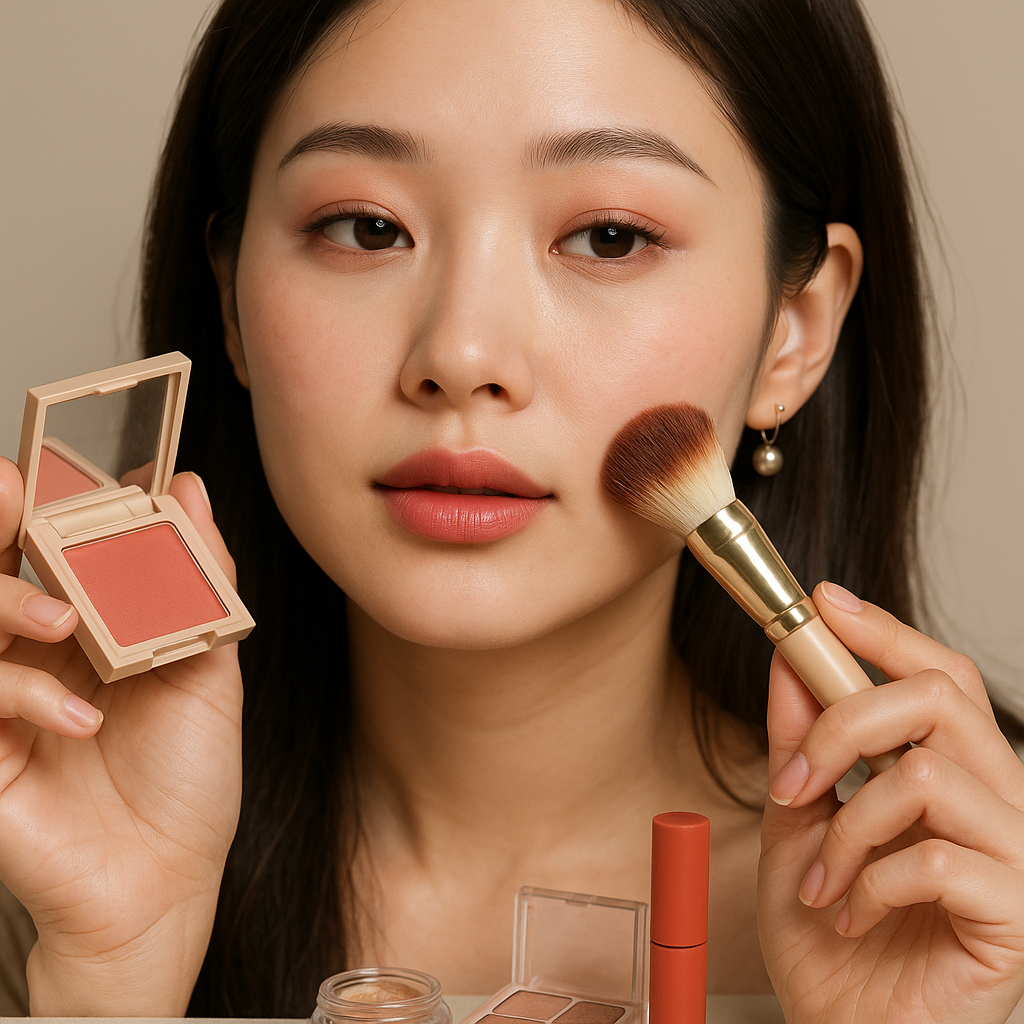 O blush na maquiagem coreana é aplicado não apenas nas bochechas, mas em um padrão específico que inclui a ponta do nariz e até a testa, criando uma aparência de fluxo natural da cor. Você escolhe tons suaves de pêssego, rosado ou coral claro, aplicando com um pincel redondo e pressionando levemente para um efeito “de dentro para fora” que simula um rubor natural. Esse padrão de aplicação difuso é totalmente diferente do contorno ocidental, evitando linhas duras ou sobreposição óbvia de cor.